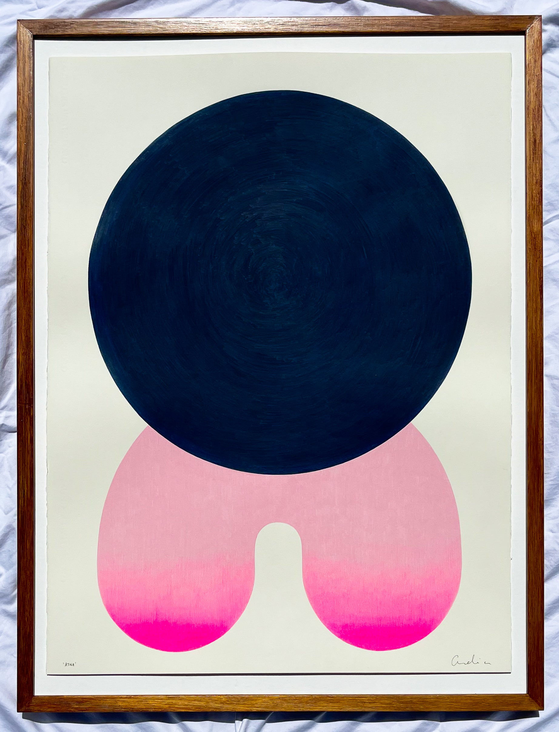 Ajna explores the tension between depth and whimsy through bold contrasts of colour and form. A dense indigo circle dominates the composition, grounded above a gradient of soft pink that fades into vibrant fluorescent tones.
