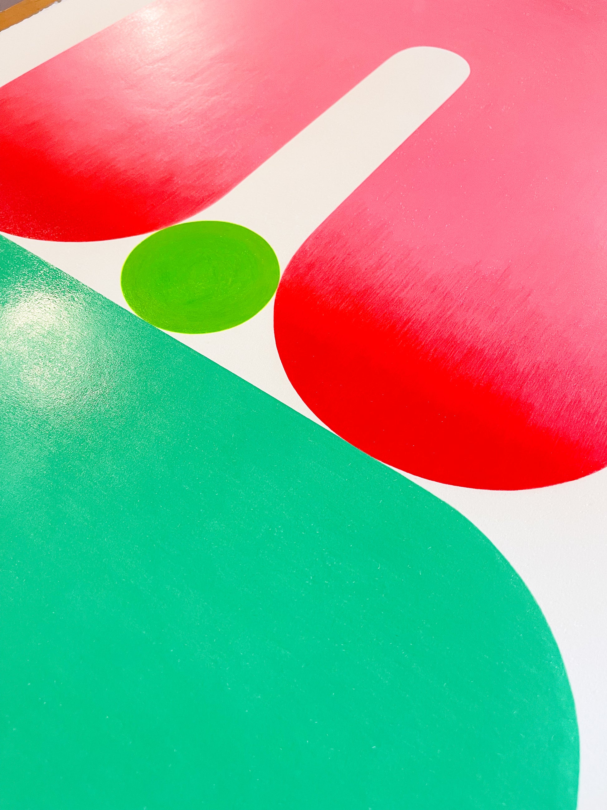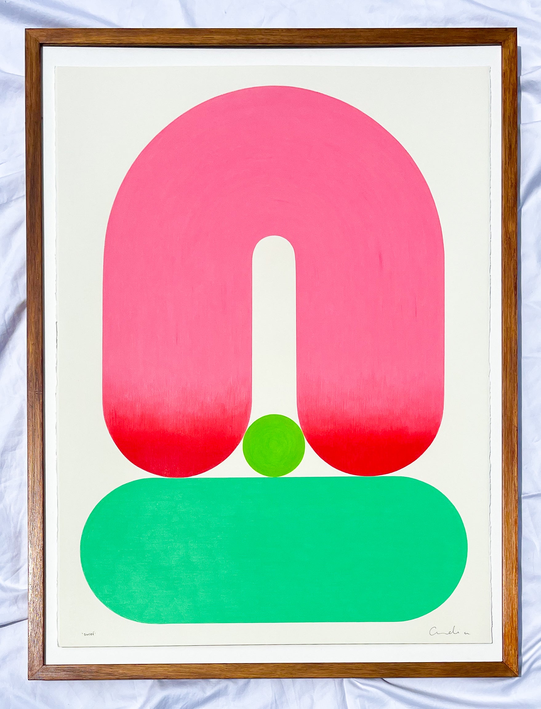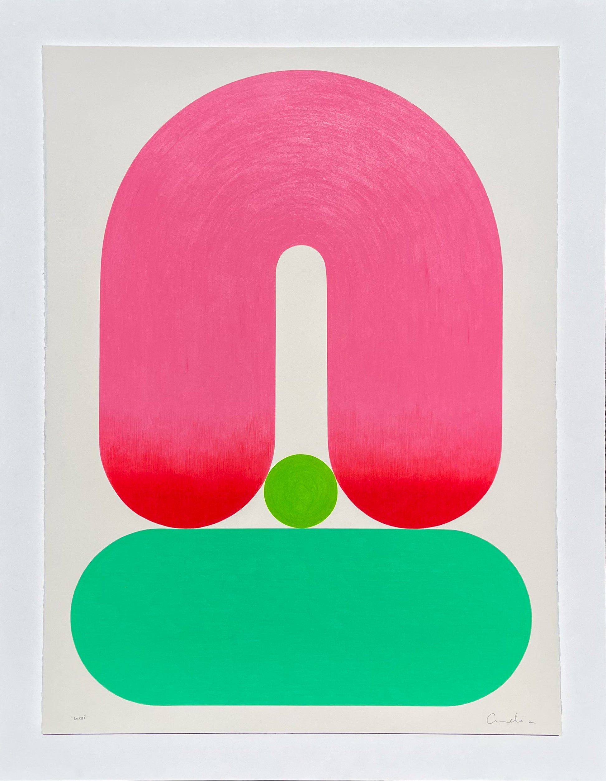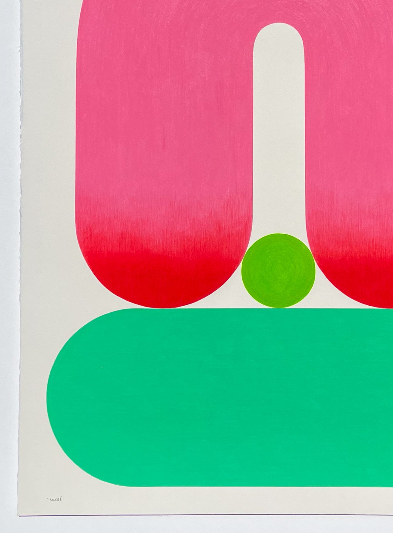 The work draws on a palette of deliberately insipid pinks and greens, tones often dismissed for their softness, and recontextualises them within a structured, contemporary form. In doing so, these gentle hues gain a new gravity: what once felt delicate becomes composed and assertive.